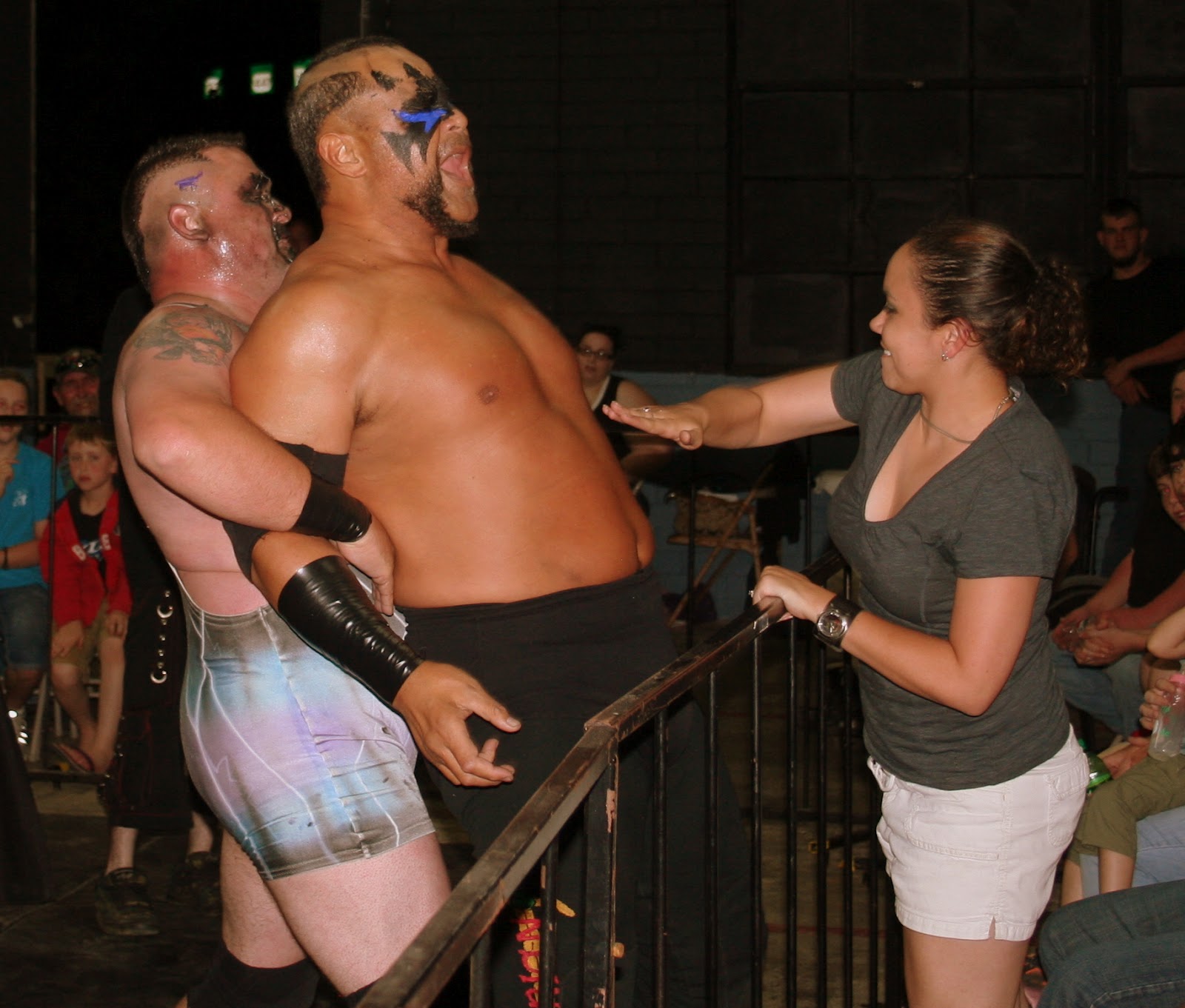 The crowd was totally into it, screaming and cussing at the wrestlers. The wrestler's would even let the audience get physically involved as the good guys would hold the bad guys and let audience members (usually girls) slap their chests.