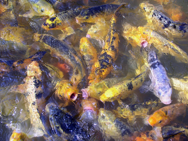 First of all, the lake is filled with the largest most aggressive, frightening Koi I have ever seen.