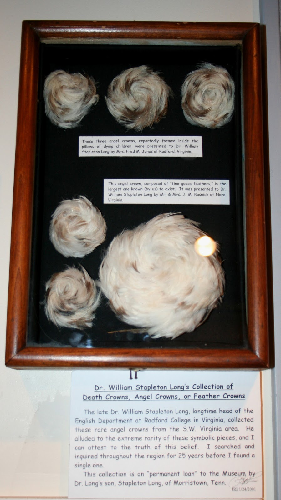 One of the strangest displays is the collection of "Angel Crowns", mysterious swirls of feathers found in the pillows of dead children.