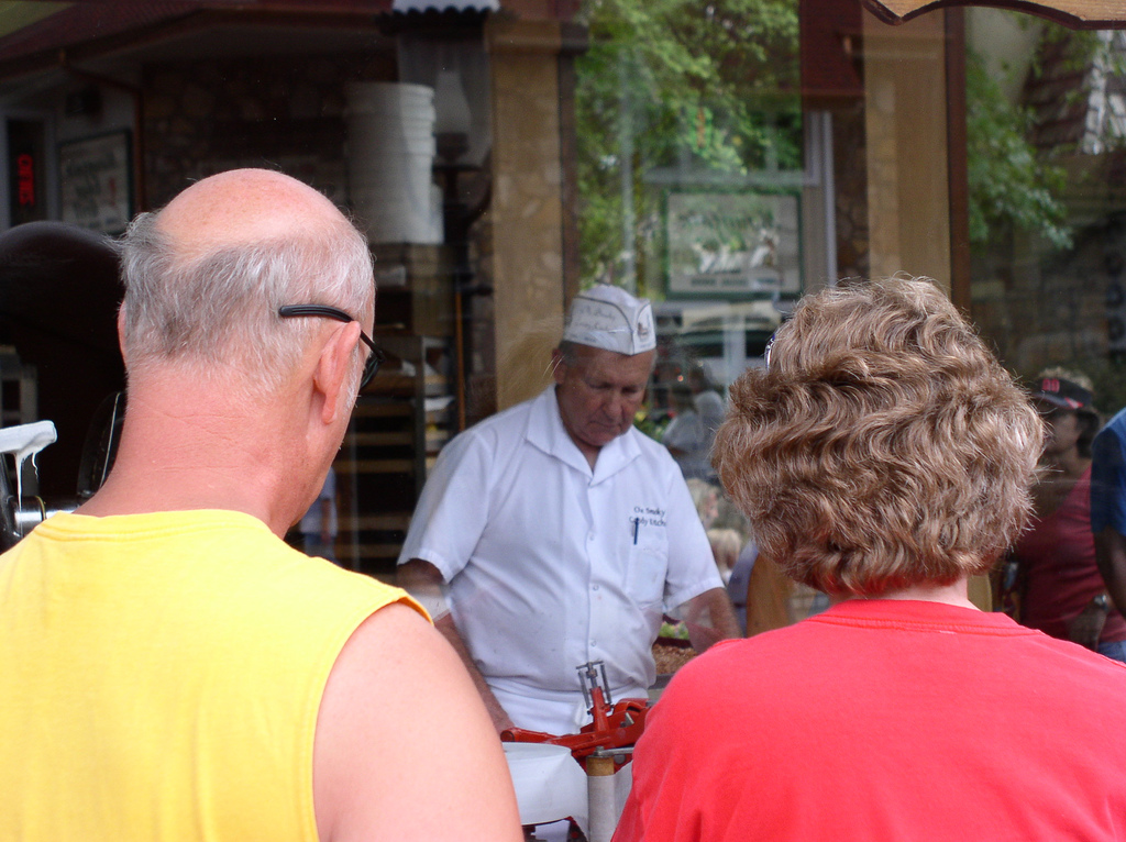 On the crowded streets of Gatlinburg are endless rows of fudge shops, gift shops, and tourists watching taffy being made.
