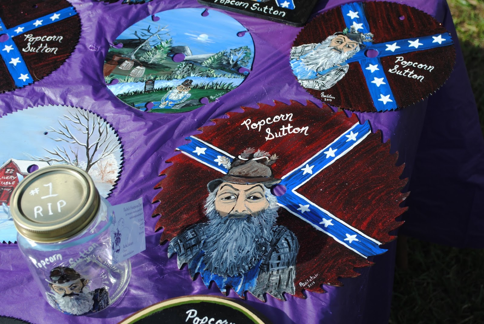 Hillbilly Woodstock was a celebrations of all things Popcorn Sutton. His wife wold T-shirts and videos. At her table was this touching portrait of Popcorn, complete with his replica of his infamous tombstone.