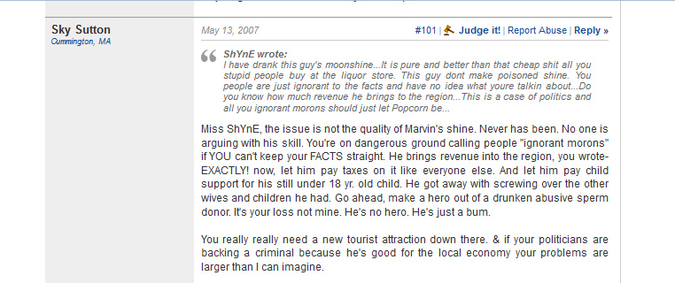 Sky also denounces "Popcorn's White Whiskey", the LEGAL line of Moonshine with Popcorn's name on it, which is owned by Popcorn's wife Pam and Hank Williams Jr. of all people.