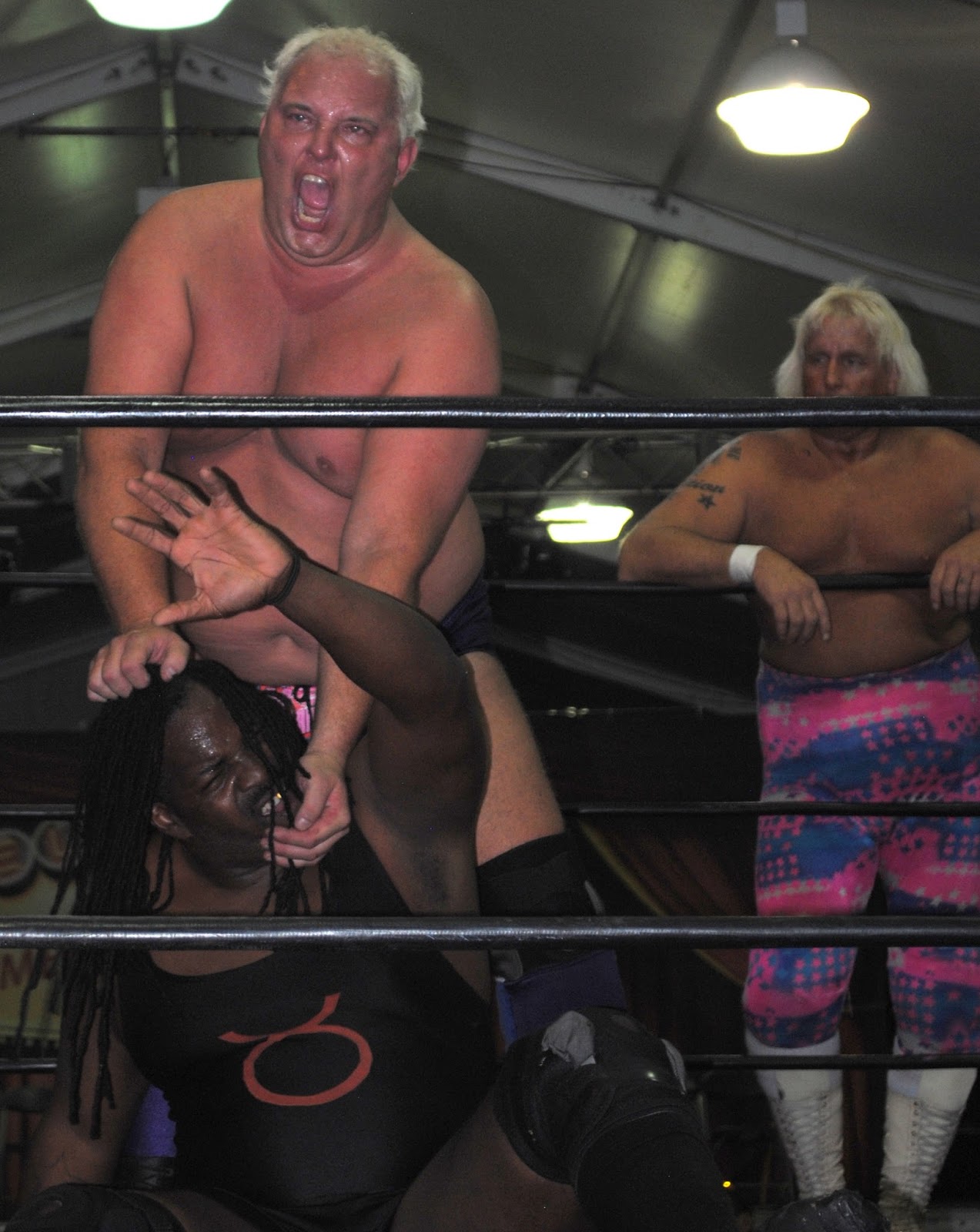 He was announced as being from Louisiana, so I thought he may have had a voodoo thing going on. For some reason he did not seem to speak English and growled and made animal noises and occasionally screamed in gibberish. Some may think the gimmick was a little insensitive. Later, we were treated to two dancing African American gentlemen who called themselves the "Soul Patrol" and claimed to be from "Chocolate City".