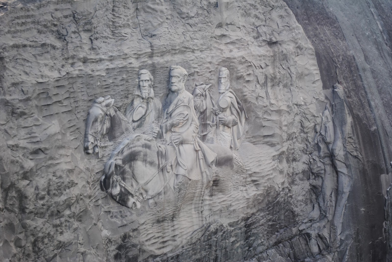 Carved into the Rocky face of Stone Mountain is the world's largest bas-relief sculpture. Three Icons of the American Confederacy are carved into the Mountainside: Confederate Generals Robert E Lee and Stonewall Jackson, along with Confederate president Jefferson Davis.